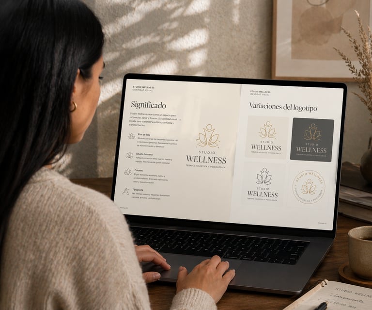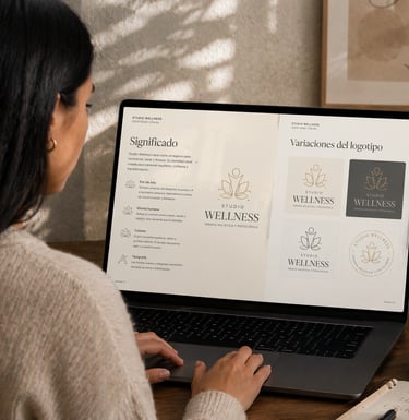 Generaremos un documento que cuente la historia que hay dentro del logo de Studio Wellness como el significado del nombre, la representación de cada símbolo y la combinación de colores que le da vida a la identidad del centro.